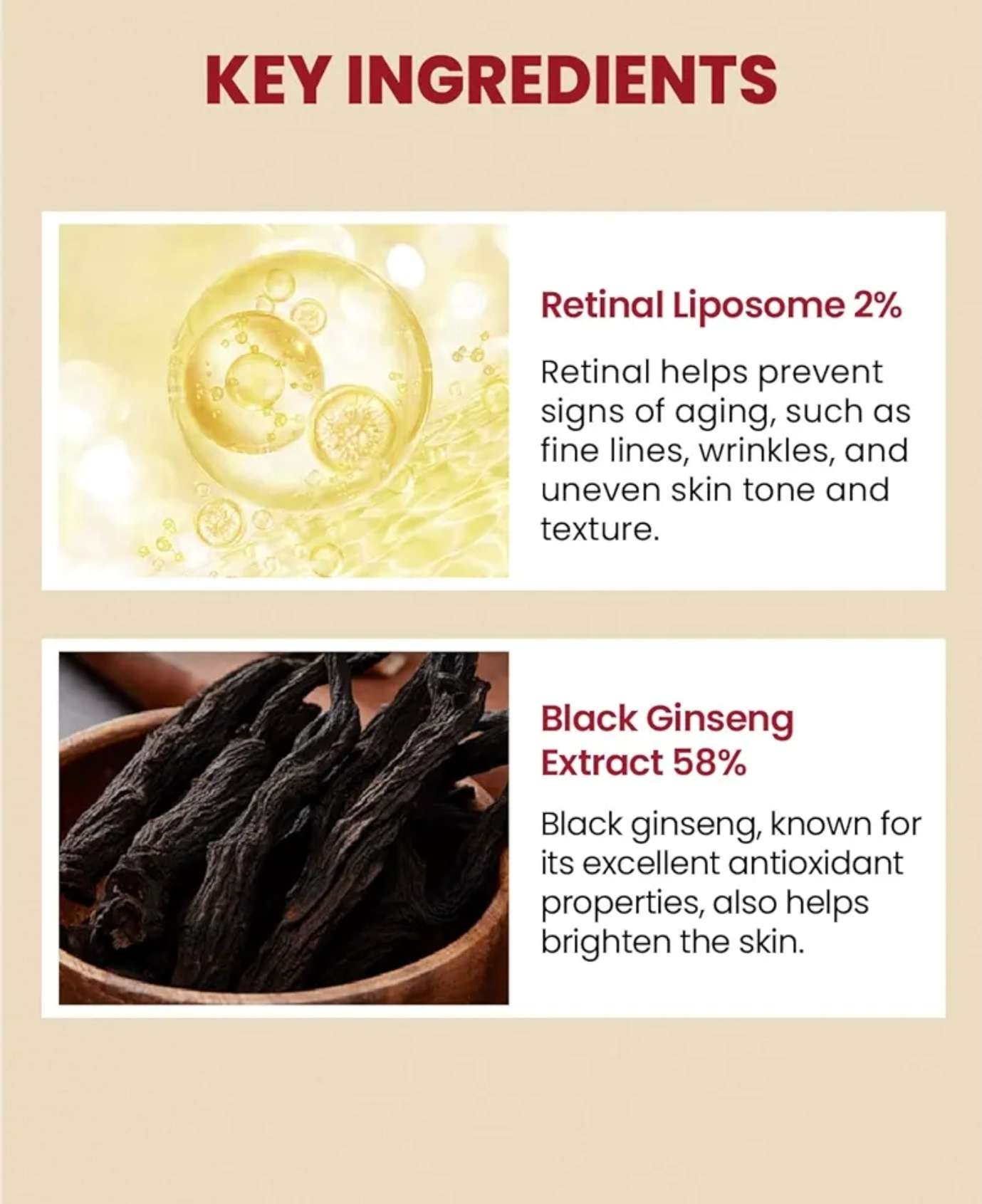 در کنار رتینال، عصاره قدرتمند جنسینگ سیاه قرار دارد. جنسینگ سیاه، که از طریق فرآیندهای پیچیده و سنتی به دست میآید، غنی از ترکیبات آنتیاکسیدانی و مواد فعال بیولوژیکی است. این ترکیب گیاهی خارقالعاده، با خواص ضد التهابی و تقویتکنندگی، به محافظت از پوست در برابر آسیبهای محیطی کمک کرده و با افزایش گردش خون مویرگی، به تغذیه و اکسیژنرسانی بهتر سلولهای پوست کمک میکند. جنسینگ سیاه همچنین در بهبود درخشش و شفافیت پوست نقش بسزایی دارد و به آن حیاتی دوباره میبخشد.